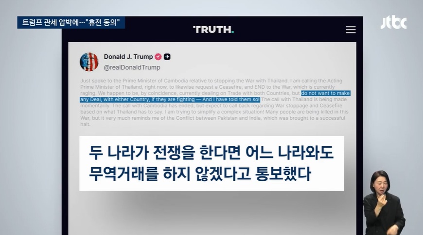 트럼프 대통령은 미국과 무역 협상을 진행 중인 태국과 캄보디아에 "전쟁 중인 국가와는 무역 거래를 하지 않겠다"는 강력한 경고 메시지를 던졌습니다. ⚠️ 이는 곧바로 양국 정부에 큰 압박으로 작용했습니다. 😫 미국은 이미 두 나라에 36%의 상호 관세를 부과하겠다고 발표한 상황이었고, 경제적으로 미국과의 관계가 중요한 양국에게 트럼프 대통령의 발언은 간과할 수 없는 위협이었던 것입니다. 💸